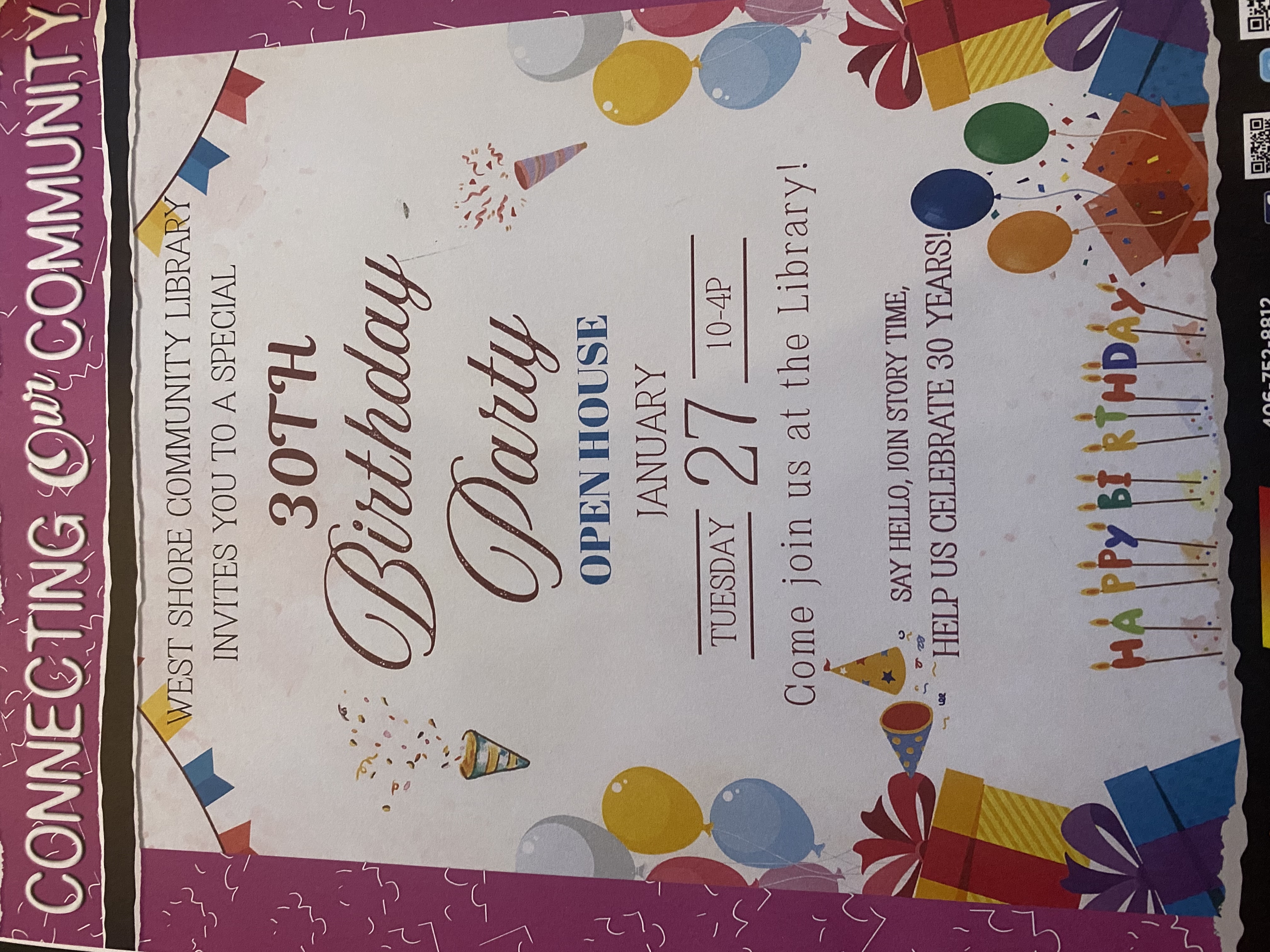 Join us at the West Shore Community Library -- celebrating 30 years on January 27th! Stop in from 10AM-4PM, say hello, bring the kids for story time at 10:30AM.